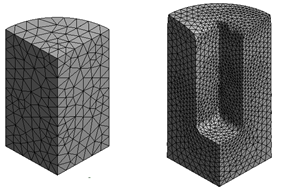 El modelo inicia con 2019 elementos y una calidad de promedio de malla de 0,76594; debido a la función de región adaptativa no lineal la simulación realiza 83 divisiones de malla a lo largo del procesamiento del MEF finalizando con 1039400 elementos y una calidad promedio de malla en el tocho deformado de 0,8086. En la figura 4 se observa el cambio de malla.