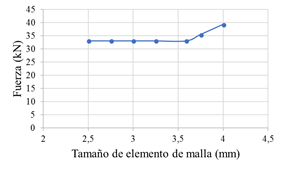 Debido al uso de la función de región adaptativa, la independencia de malla muestra un resultado de la fuerza máxima resultante del punzón para realizar la extrusión indirecta vs la cantidad de elementos iniciales en el mallado, presentándose una variación 0,38 %, de acuerdo con la Figura 5. Las simulaciones presentadas en este trabajo, inician con un tamaño de elemento de malla de 3,5981 mm por ser el valor que consume menor tiempo computacional y presenta mayor número de divisiones de elementos.