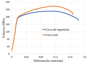 A partir de los ensayos realizados, se construye la curva esfuerzo vs deformación real y la de ingeniería (ver figura 6), los cuales muestran el comportamiento elástico y plástico del aluminio a trabajar.