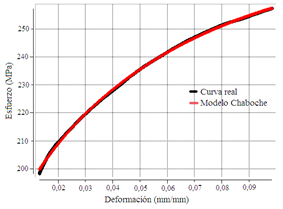 2 Propiedades mecánicas del materialEl modelo se utiliza debido a la aproximación que presenta con la curva real de deformación en la zona plástica, la cual se puede observar en la figura 7.