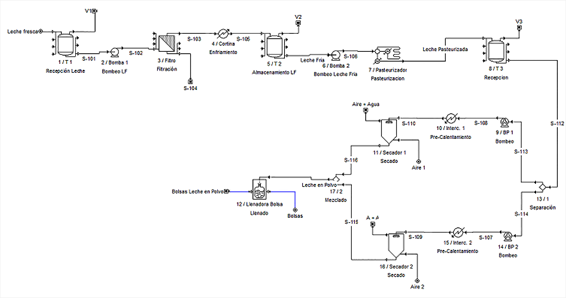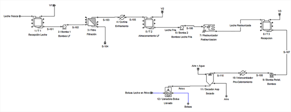 En la Figura 1 se presenta el diagrama de flujo del proceso de producción (Caso Base) obtenido mediante el simulador SuperPro Designer®. Se vierten 1.977,6 kg/lote de leche de cabra fresca en un tanque de 4 m3 de volumen, la cual es bombeada a continuación hacia un filtro colador para remover partículas extrañas que puedan existir en suspensión. A la salida del filtro, la leche transita por un intercambiador de calor (enfriador) donde se reduce su temperatura hasta 4 ºC utilizando glicol como medio de enfriamiento. La leche fría a 4 ºC es almacenada en un tanque isotérmico de 4 m3 de capacidad. Una vez enfriada, la leche es pasteurizada a 72 ºC, y luego enfriada hasta 10 ºC en el mismo equipo, el cual emplea vapor de agua y agua fría como agentes de calentamiento y enfriamiento, respectivamente. La leche pasteurizada a 10 ºC de temperatura es almacenada en un tanque isotérmico de 3,5 m3 de capacidad, desde donde se envía por medio de una bomba peristáltica hacia un intercambiador de calor de tubo en tubo para incrementarle su temperatura hasta 60 ºC, para entonces ser enviada de forma continua hacia el secador por atomización a un caudal de alimentación de 25 L/h. En el secador se obtiene la leche en polvo a una temperatura de 80 ºC y una humedad de 5,7%. Por último, la leche en polvo es envasada en bolsas de nailon con una capacidad de almacenamiento de 600 g cada una, utilizando para ello una llenadora de bolsas con una capacidad de llenado de 36 bolsas por hora.