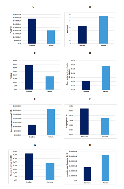 La Fig. 4 muestra una comparación de los valores de VAN, TIR, PRI, costo unitario de producción, ingresos anuales netos, margen grueso, retorno de la inversión e inversión total de capital obtenidos para la Variante con respecto al Caso Base.