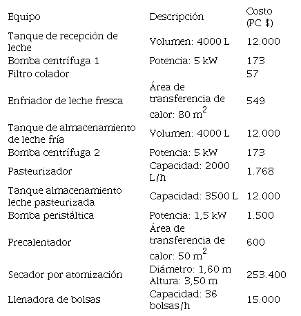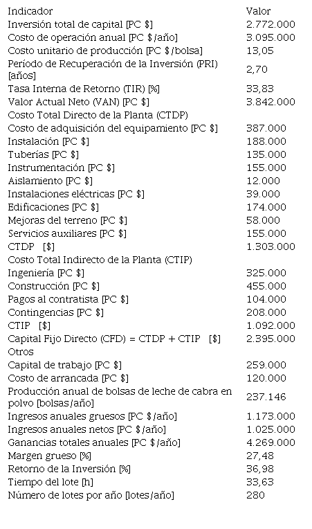 Se toma una capacidad de procesamiento de 1.977,6 kg de leche de cabra fresca por lote, con un período de construcción de la planta de 18 meses y 3 meses para efectuar la arrancada y puesta en marcha. Todos los valores y resultados tanto económicos como monetarios se expresan en pesos cubanos (PC). La planta operará 11 meses al año, con 1 mes disponible para efectuar labores de mantenimiento de equipos y sistemas auxiliares, mientras que se considera que tendrá un tiempo de vida de 20 años. Se asume un 11% de interés para determinar el VAN, un 32% de impuestos por concepto de ingresos, se gastan PC $ 5000 al año por concepto de publicidad y ventas, y que la planta operará al 80 % de su capacidad total durante los cinco primeros años, para luego operar al 90 % por el resto del tiempo de vida. Se supone que no existe rechazo de producto por no cumplir con los requisitos de calidad, que el costo de arrancada y validación se toma como un 5% del capital fijo directo, que el costo relacionado con el funcionamiento del laboratorio se toma como un 15% del costo total de mano de obra, y que no existe gasto económico debido a procesos de investigación y desarrollo (I+D) en la planta. Se estima la contribución de cada componente sobre la inversión de capital fijo basados en el rango sugerido por (Peters et al., 2003). Se toma además un salario de PC $ 1,36/h para operarios y personal de mantenimiento, y de PC $ 2,00/h para supervisores y personal de dirección, mientras que el costo de adquisición tanto de la leche fresca de cabra como de las bolsas de nailon vacías se toma en PC $ 5,00/L y $ PC 0,10/bolsa, respectivamente. La planta emplea todos los servicios auxiliares comúnmente consumidos en una planta de este tipo, esto es, agua de enfriamiento, electricidad, vapor de agua y aire comprimido (Tabla 2). Se asumió que el costo de tratamiento de aguas residuales (principalmente aguas residuales provenientes de las operaciones de limpieza y desinfección de equipamiento, accesorios y áreas) es de 30 % de los costos de operación, y se especificó un costo de la electricidad de $ 1,20/kWh. Por último, el costo de venta de la bolsa de leche de cabra en polvo de 600 g se toma igual a PC $ 18,00.