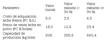 Se procederá a evaluar la influencia de 3 variables de entrada o iniciales, las cuales son 1) costo de adquisición de la leche de cabra fresca; 2) precio de venta de la leche de cabra en polvo; y 3) capacidad de producción de leche de cabra en polvo por lote, sobre tres indicadores de salida: Valor Actual Neto (VAN), Tasa Interna de Retorno (TIR) y Período de Recuperación de la Inversión (PRI). Las tres variables de entrada consideradas fueron especificadas para variar dentro de un porcentaje determinado, con el fin de tomar en cuenta fluctuaciones esperadas de sus valores en el futuro (Tabla 4).