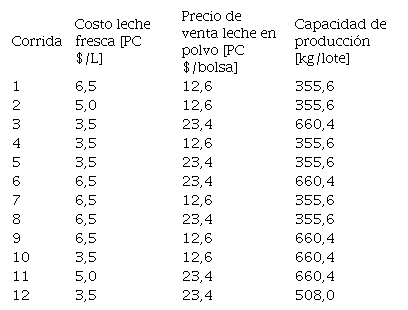 La Tabla 7 muestra los resultados del estudio de sensibilidad efectuado tomando en cuenta las 12 corridas realizadas.