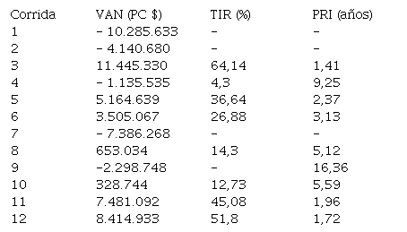 Por último, se determinó la corrida (o escenario) con el resultado económico más positivo con respecto a los valores de VAN, TIR y PRI obtenidos, asi como también aquella con el más negativo.