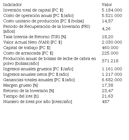 La Tabla 6 muestra los resultados de los principales indicadores técnico-económicos obtenidos durante la simulación del proceso de producción de leche de cabra en polvo (Caso Base) en el SuperPro Designer®.