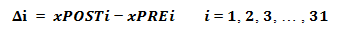 Para llevar a cabo el análisis bayesiano inicialmente se debe calcular la diferencia entre las mediciones PRE y POST, en este caso particular se trabajó con el valor absoluto de cada medición, ya que el signo representa el tipo de movimiento o momento realizado. Estas diferencias se representaron por 𝚫, dichas diferencias se calcularon como POST versus PRE.
