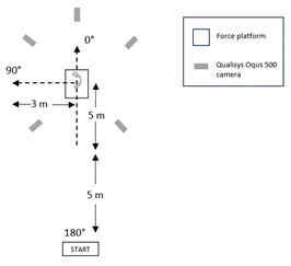 El movimiento en tres dimensiones de los marcadores ubicados en los miembros inferiores se recolectaron mientras realizaban las maniobras utilizando cinco cámaras optoelectrónicas Qualisys modelo Oqus 5 (Gothemburg, Sweden) con una frecuencia de muestreo de 150 Hz, por medio del software Qualisys Track Manager (QTM versión 19.2; Qualisys) se realizó el procesamiento inicial de los datos de las trayectorias, la identificación y llenado de gaps en la señal de cada marcador y para el procesamiento e integración de datos cinemáticos y cinéticos por medio del software Visual 3D (C-motion Biomechanics Software, Inc) . Las fuerzas de reacción de la tierra (GRFs) se recolectaron de una plataforma de fuerza AMTI (modelo No. 600600; Advanced Mechanical Technology Inc) empotrada al suelo del laboratorio con una frecuencia de muestreo de 1000Hz.