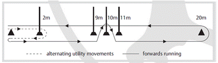 Estudios anteriores demuestran que la fatiga durante un partido de fútbol está asociada a la disminución del control muscular, esto puede estar relacionado con mayor riesgo de presentarse lesiones a nivel de miembros inferiores observadas durante los últimos 15 min de cada mitad del juego. El protocolo fatiga (SAFT90) empleado fue desarrollado para replicar las demandas fisiológicas y mecánicas que se generan durante un partido de fútbol. Este protocolo se desarrolló sobre la base de datos contemporáneos de análisis de tiempo-movimiento. El protocolo se divide en dos períodos de 45 minutos intercedidos con un intervalo de descanso pasivo de 15 minutos. Está diseñado para incluir movimientos de utilidad multidireccional, cambios de dirección, aceleración y desaceleración frecuentes, inherentes al fútbol. Se ha validado para replicar la respuesta a la fatiga de la jugada de partido de fútbol (Small et al., 2009). El esquema se basó en una carrera de 20 m incorporando cuatro estacas de campo posicionados en las distancias que se observan en la Fig 2. Los sujetos realizan esto corriendo hacia atrás y rodeando la primera estaca, luego corriendo hacia adelante en línea recta, una vez se acerca al conjunto de tres estacas, sigue su movimiento a través de ellas, generando así cambios de dirección al pasarlas. Finalmente, continúa el recorrido hasta llegar a la posición inicial. Se desarrolló un perfil de actividad de 15 minutos y repitió seis veces durante el partido de fútbol simulado completando un total de 90 minutos. El perfil de actividad se realizó de manera aleatoria e intermitente. Para que los sujetos pudieran realizar este protocolo, se recomendó no realizar ejercicio vigoroso 24 h antes de la prueba y no consumir cafeína o alcohol.