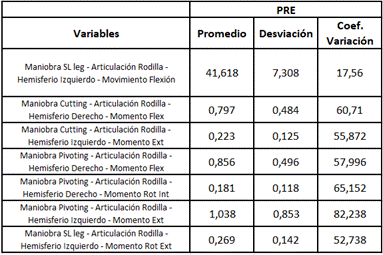 Se inició con un análisis exploratorio para las mediciones pre y post de los 30 jugadores de fútbol. En las mediciones pre se observó que en la flexión de rodilla izquierda en la maniobra single landing leg presentó la menor variabilidad observada (17,56%, rango de baja distancia entre las mediciones) mientras que las mediciones del momento flexor de la rodilla derecha y el momento extensor de la rodilla izquierda en la maniobra corte, el momento flexor de la rodilla derecha, momento extensor de la rodilla izquierda y el momento rotador interno de la rodilla derecha realizando la maniobra pivote y el momento rotador externo de la rodilla izquierda realizando la maniobra single landing leg, presentaron la mayor variabilidad observada (superior a 52,73%), esto se puede visualizar en la tabla 1.
