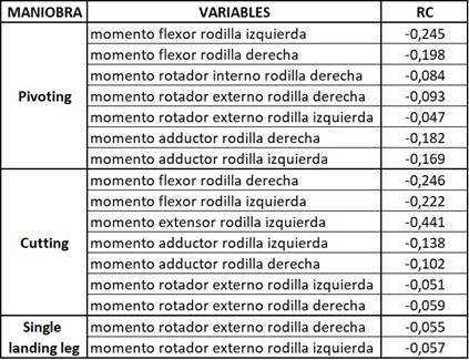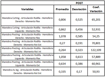 En los resultados del análisis exploratorio de las mediciones post, se encontró que las variables medidas del momento flexor de la rodilla derecha e izquierda durante la maniobra de corte, el momento flexor de la rodilla derecha e izquierda, momento rotador interno y externo de la rodilla derecha y el momento extensor de la rodilla izquierda durante la maniobra de pivote y el momento rotador externo de la rodilla derecha durante la maniobra de aterrizaje en una sola pierna presentaron la mayor variabilidad observada (superior a 52,93%).