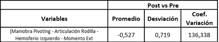 En la tabla 3 se observan los resultados del análisis exploratorio para las mediciones post versus pre, en este se evidenció que dichas diferencias presentan rangos de variación muy amplios, la mínima variabilidad se observó para las diferencias de las mediciones del momento extensor de la rodilla izquierda al ejecutar la maniobra pivote.