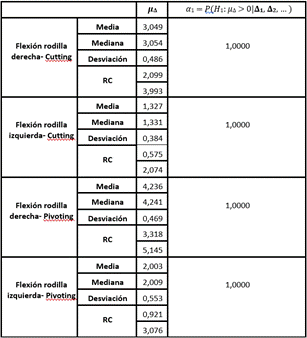 Según la hipótesis planteada se espera que existan cambios cuando hay presencia de fatiga al ejecutar las maniobras establecidas, se evidenció por lo tanto que hubo cambios en las variables de flexión y extensión de rodilla cumpliendo la hipótesis alterna donde se estableció que las medidas post son mayores que las medidas pre, cumpliendo con la condición 𝛼1 = 𝑃(𝐻1: 𝜇Δ > 0|𝚫𝟏, 𝚫𝟐, … ), donde RC>0. Esto se pudo evidenciar principalmente en las siguientes variables, en diferentes situaciones de puntos de comparación: