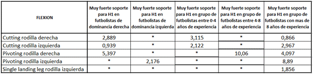 En las variables cinéticas como los momentos de fuerza en la articulación sobre los tres ejes de movimiento, no se evidenciaron cambios significativos después de la fatiga generando débil soporte para la hipótesis alterna. De hecho, en la maniobra de pivote se presentó débil soporte en una mayor cantidad de variables en comparación con las maniobras de corte y aterrizaje de un salto en una sola pierna de ambos miembros inferiores. Esto se puede relacionar con lo encontrado por Barber-Westin donde refiere no hay diferencias uniformes entre tareas planeadas (anticipadas) y tareas reactivas (no anticipadas) respecto a efectos de la postfatiga en las variables cinemáticas y cinéticas de los miembros inferiores.