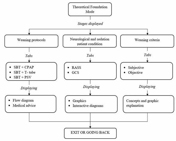 The application has two modules based on scientific information and medical guidelines support regarding weaning protocols in mechanical ventilation. Its structure has some features about clinical making-decision and theoretical support. The first mode (Theoretical foundation) allows medical students to learn and to train through the theoretical foundation shown interactively. It means that it has an adequate representation throughout flow diagrams, tables, and interactive graphics. Thus, those stages display accurate information regarding weaning protocols, neurological and sedation patient conditions, and weaning criteria.