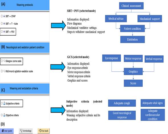 As is shown in Figure 2, the main window of the Theoretical foundation displays a panel, which is denoted through the letters A, B, C, and D. The first one (A) displays the weaning protocols available to interact. Those are SBT + CPAP, SBT + T-tube, and SBT + PSV, where users can push the radio button, which represents each protocol. In the same manner, the second one (B) provides two options to choose between two crucial tests carried out by physicians in clinical practice: GCS and RASS. The third one (C) displays two choices regarding both subjective and objective criteria weaning criteria, which doctors should follow in the performing of weaning trials. The last block (D) represents the help buttons (user guide, terminology), along with go back option. It is important to keep in mind that they appear in the two application modules.