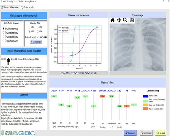 In Figure 3, is presented the interactive module of the first clinical report and the third weaning trial (WT3) registered on the database. It has a set of stages and graphics, which are: (i) Clinical reports and weaning trials: It is a block, which presents a set of clinical reports along with the weaning trials. Users can choose and switch to another clinical report or weaning trial whenever they desire to see and explore the weaning protocol carried out, as well; (ii) Patient information and clinical evaluation: A graphic stage shows the patient's anthropometric measures and a summary of their clinical background. It also includes the medical reports and notes about the mechanical ventilator treatment, weaning trials, and the statement into the ICU; (iii) Comments: Below to the stage mentioned above, a block shows the most relevant information and notes taken by doctors through the weaning trial. It also provides the decisions carried out in that test, and the explanation of the final decision. It means whether the patient overcomes the weaning trial or not. For instance, in that result, the patient did not pass the test due to his level of agitation and diaphoresis; (iv) Pressure vs Volume Curve: This graphic is displayed along with both inspiration and explanation curves during the weaning trial. It also provides the mechanical ventilator and settings programmed by physicians. Therefore, users can analyze that graphic and conclude its condition and well technique to perform into a specific weaning trial; (v) X-ray image: As part of the graphic filed, an x-ray image is displayed, which provides users information about breast patient anatomy. Each image was taken the same day as the weaning trial. Moreover, it has a panel, which allows zoom, move, and save the image.