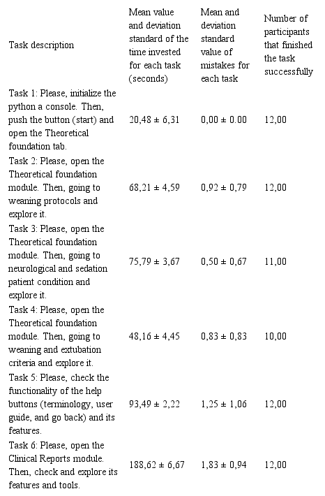 On the other hand, in Table 1, is presented the results and the statistical measurement of the first phase of the usability testing. It is important to consider that the mean values of the data are shown along with the standard deviation. The first column represents the time invested for each user in the targeted task to finished it; there, it is possible to appreciate that the higher value (188,62 ± 6,67 seconds) is for task 6 and the lower one (20,48 ± 6,31 seconds) is for task 1, respectively. In the same manner, the second column displays the mean of the mistakes made by users for each task, where the highest values match to task 6 (1,83 ± 0,94), and the lowest one corresponds to task 1 (0,00 ± 0.00). Finally, only 10 participants could finish the task 4 without problems; meanwhile, the other tasks did not represent some inconveniences.