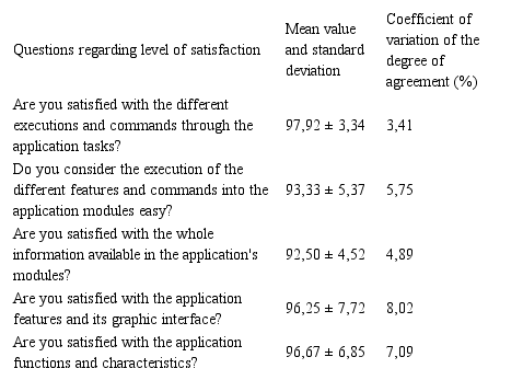 The results of the second part of the usability testing are shown in Table 2. It presents the questions according to the satisfaction level with the application features. It is possible to appreciate that the whole mean values are greater than 92%, and the coefficient of variation values is less than 10%. Thus, those means could be considered as a representative measurement of users’ level of agreement for each question presented into the usability testing.