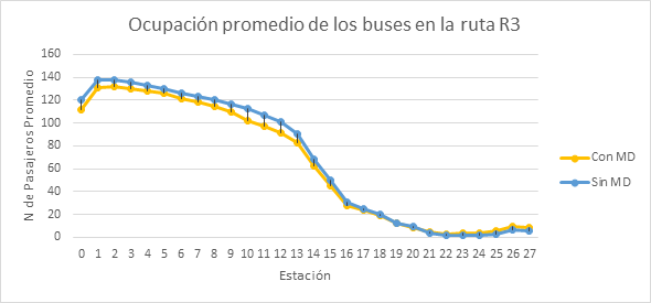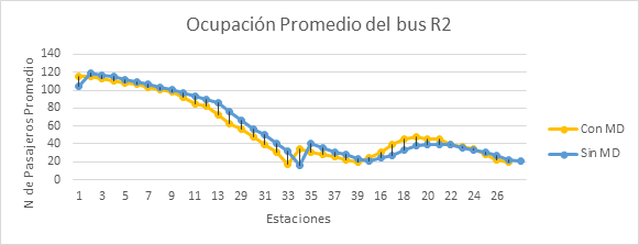 Al calcular, la ocupación promedio de los buses a llegar a cada estación, en los dos escenarios (sin modelo de decisión Sin MD y con modelo de decisión Con MD), se puede observar, que al no tener un modelo decisión, la ocupación promedio de los buses es más alta (Ver Gráfica 1), dado que a los pasajeros no les importa si el bus va muy lleno o no, puesto que sólo tienen en cuenta, la distancia más corta para alcanzar su destino al establecer su ruta factible. Cuando existe un modelo de decisión, en donde los pasajeros hacen una comparación entre la comodidad de viaje tiempo que deben esperar adicional por otro bus, la ocupación promedio es menor, puesto que algunos pasajeros deciden no abordar los buses y esperar el siguiente, dándole prioridad a la comodidad. De esta forma se evidencia, que a pesar de haber sólo 2 rutas disponibles para todos los pasajeros del sistema simulado, los flujos a través de estas pueden variar de acuerdo a la saturación de pasajeros en el sistema.