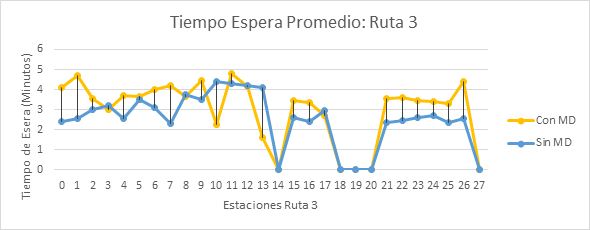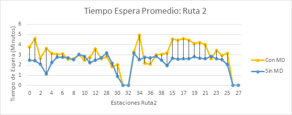 El escenario con modelo de toma de decisiones para los pasajeros, hace qué el tiempo de espera promedio se incremente debido a que los usuarios no siempre que se suben el primer bus que les sirve, sino que también priorizan la comodidad sobre el afán de llegar antes a su destino.