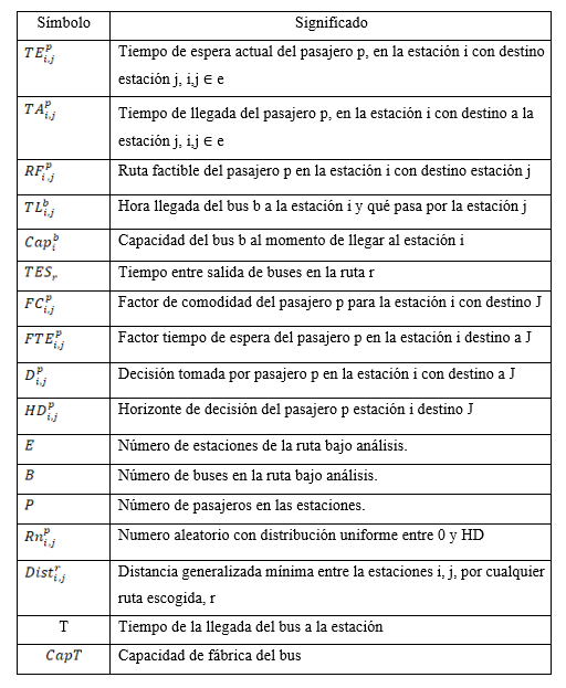 Sean las variables: E, (e ∈ N= {0, 1, 2, 3,…}) para denotar el número de la estación, B, (b ∈ N= {0, 1, 2, 3,…}) para denotar el número del bus (el bus que se despacha primero tiene números más pequeños) y R, (r ∈ N= {0, 1, 2, 3,…}) para denotar las rutas del sistema (en este caso solo hay dos rutas (2 ,3)). En la Tabla 1. se muestra la notación y las variables establecidas y P, (p ∈ N = {0,1, 2, 3,…}) el número de pasajeros que van llegando al sistema.