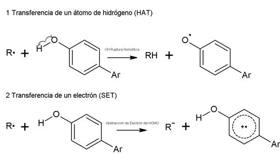 Los polifenoles como antioxidantes tienen dos mecanismos de acción, en el primero la molécula de polifenol reacciona con el radical libre, con la transferencia de un átomo de hidrógeno. En el segundo el oxidante transfiere un electrón singlete a la molécula del polifenol, Figura 1. El producto de ambos mecanismos son: un radical oxidado, un catión radical y una especie energéticamente estable Leopoldini, et al. (2011).