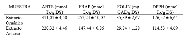 La capacidad antioxidante de un extracto no viene dado por la suma de las capacidades antioxidantes de cada uno de sus componentes. Los compuestos interactúan entre sí pudiendo producirse efectos sinérgicos o inhibitorios Kuskoski, et al. (2005). Para medir la capacidad antioxidante de un extracto se han adoptado un amplio rango de ensayos espectrofotométricos, entre los más frecuentemente usados están los ensayos antioxidantes in vitro, los cuales utilizan un captador de radicales libres y son relativamente sencillos de realizar. Entre los ensayos de captación de radicales libres se encuentran el método DPPH (1,1-difenil-2-picril-hidrazilo), el ensayo de decoloración ABTS (Ácido 2,2′-azino-bis-3-etilbenzotiazolin-6-sulfónico) Alam, et al. (2013), Polifenoles totales por el reactivo (Folin-Ciocalteu) Blainski, et al. (2013), y el ensayo de la Capacidad de reducción Férrica Antioxidante Pulido, et al. (2000).