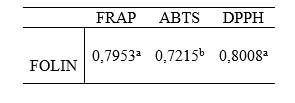 Para observar la relación existente entre el contenido de polifenoles totales y los métodos in vitro usados para determinar la capacidad antioxidante se calcularon los coeficientes de correlación descritos en la tabla 2.