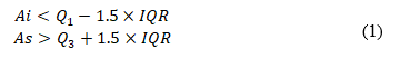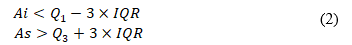 El proceso de detección de valores atípicos se utilizó el rango intercuartílico (IQR), es decir, la diferencia existente entre el primer cuartil Q1 y el tercer cuartil Q3 Kolden, Weisberg. (2007); Homar, et al. (2010). En un diagrama de cajas se puede representar e identificar los tres cuartiles, el rango intercuartílico y los valores atípicos, en los valores atípicos se consideran dos tipos: (a) valor atípico leve (Ecuación 1) y (b) valor atípico extremo (Ecuación 2). A continuación, se presenta el cálculo de estos dos tipos de valores atípicos.
