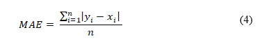 · Error Medio Absoluto (MAE)Donde, n corresponde a la cantidad de registros, yi es el valor de predicción y xi corresponde al valor verdadero.