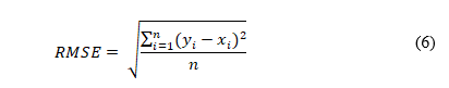 · Raíz del Error Medio Cuadrático (RMSE)Donde, n corresponde a la cantidad de registros, yi es el valor de predicción y xi corresponde al valor verdadero.