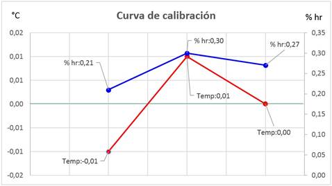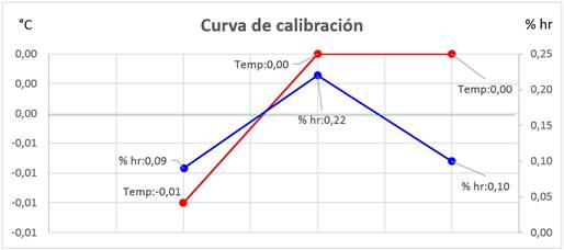 Durante la ejecución de la calibración, se obtuvieron factores de corrección de -5,9 °C ± 0,36 °C y -5,5 %hr ± 1,4 %hr, lo cual sugiere un sesgo elevado en el indicador de la incubadora, que puede ser corregido por el usuario con estos factores.