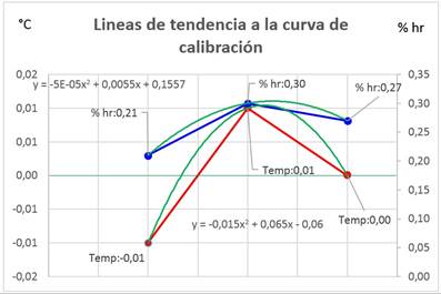 En la Fig. 3 se observa el cálculo del polinomio para el patrón número uno, las líneas de tendencia tienen forma de parábola entre los extremos de la curva de error, esto aumentaría el error de indicación en vez de igualarlo al real para el caso de corrección en la variable temperatura.