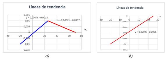 Para solucionar el error por corrección, se descomponen las curvas de error en dos, se tienen dos gráficos lineales para cada variable, a las cuales se les puede calcular nuevas líneas de tendencia como se muestra en la Fig.4 a). En la Fig.4 b) se muestra la línea de tendencia para el patrón número dos, la corrección en temperatura es cero entre 25 °C y 70 °C (ver Fig.3), se calculó la ecuación lineal para el intervalo entre -20 °C y 25 °C.