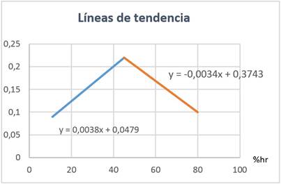 Se descompone la curva en dos curvas lineales para calcular las líneas de tendencia como lo muestra la figura 5.