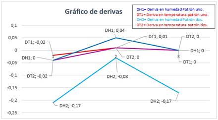 Las derivas de los patrones tienden a formar una línea recta en cero, lo cual garantiza su calidad metrológica, con dos calibraciones se están estabilizando, salvo el patrón dos en la variable humedad que presenta una deriva cerrada que con el tiempo tenderá a estabilizarse también.