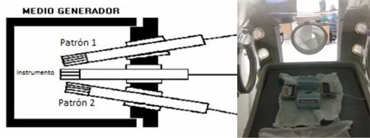 , tanto para el instrumento a calibrar como para el patrón de referencia (4).