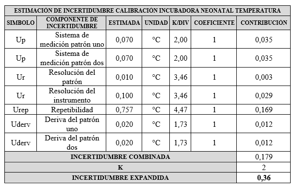 Se estimaron las diferentes fuentes de incertidumbre de tipo A y B para cada variable calibrada, para llegar a la incertidumbre expandida, ésta ultima de gran importancia al momento de aplicar los resultados obtenidos como se observa en las tablas 1 y 2.