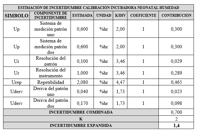 Durante el proceso de calibración de la incubadora neonatal, se emplearon dos termohigrómetros digitales patrón, con incertidumbre de calibración del orden del 1,0 % hr o mejor en humedad y de 0,1 °C o mejor en temperatura, para un nivel de confianza de aproximadamente 95 %.