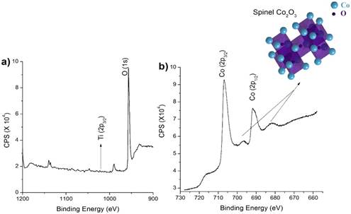 Fig. 1 shows the obtained XPS spectrum for the sample fabricated with a 30 min deposition time and post-deposition annealing at 873K for 5 h. As it can be observed, titanium, oxygen and cobalt species are evident in the surface of the sample. Annealing in ambient conditions enforces the oxidation of the thin film, causing the formation of the cobalt oxide species: Co3O4. This particular compound is commonly known as a mixed-valence compound, wherein the transition element can exhibit 2 separate oxidation states simultaneously, in this case, +2 and +3.