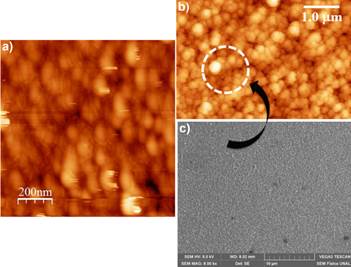 Scanning electron microscopy measurements were carried out using the VEGA 3SB electron microscope equipped with a tungsten filament, data collection was made under high vacuum conditions (10-6 mbar) using an Xflash 410 m detector. Morphological characterization was complemented with Atomic Force Microscopy measurements (AFM) in tapping mode employing a (AFM ANDES).