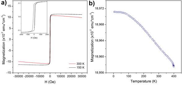 Fig. 4 shows the magnetic characterization of the intermetallic alloy deposited for 30 min. Fig. 4a) presents the variation of the magnetic moment as a function of the applied magnetic field, measured at two separate temperatures: 150 K and 300 K. The result is a hysteresis loops for the sample analyzed at 150 K and room temperature (300 K), reaching a saturation magnetization of