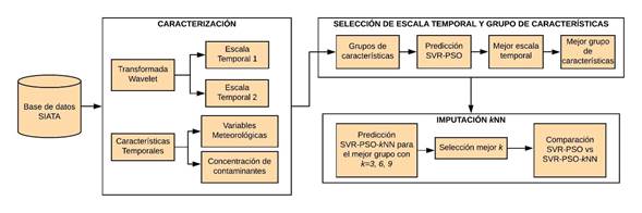 Con el fin de obtener un espacio de representación para realizar una predicción con 24 horas de anticipación de la concentración de PM10 y PM2.5 utilizando una SVR-PSO (Figura. 1), se llevó a cabo una caracterización en tiempo y tiempo-frecuencia de la concentración de los contaminantes y de las variables meteorológicas medidas por el SIATA, la caracterización en tiempo, ha sido con base al trabajo desarrollado previamente en Murillo-Escobar, et al. (2019).