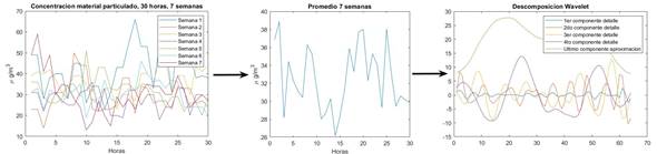 Esta escala temporal reúne información sobre el comportamiento del contaminante durante las últimas 7 semanas en la hora y día que se realizará la estimación, de este modo teniendo como objetivo predecir la concentración de PM10 o PM2.5 a la hora n (e.g. lunes 14:00), se toma el valor de la concentración del contaminante 30 horas previas de la semana anterior n-30 (e.g. domingo 8:00), además, se obtiene una muestra de las 30 horas previas a la hora objetivo durante las 7 semanas anteriores, posterior a ello, se deriva una serie de tiempo promedio a partir de las 7 series temporales, para luego aplicar la TW con 4 niveles de descomposición. Finalmente se calcula la energía y la media de cada uno de los DeCo y del ultimo ApCo de cada una de las bandas, estas características fueron almacenadas en dos grupos denominados Energías Wavelet (WaEn) y Medias Wavelet (WaMe) (Figura. 2).
