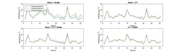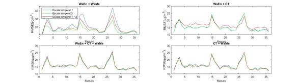 Con el fin de determinar la escala temporal y el grupo de características que ofrece las mejores capacidades predictivas del Material Particulado, se realizaron todas las combinaciones posibles de los tres grupos de características propuestos (CT, WaEn y WaMe), dando como resultado un total de cuatro combinaciones.