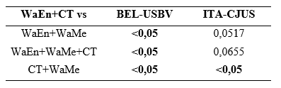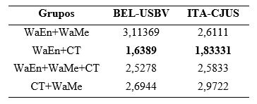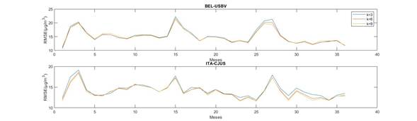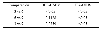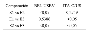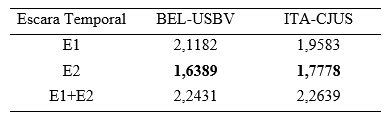 Posteriormente, el test no paramétrico de Friedman arrojó un P-Valor < 0,05, comprobando que existe una diferencia estadísticamente significativa entre las escalas temporales analizadas E1, E2, E1+E2, tanto en BEL-USBV como ITA-CJUS. El ranking de medias (Tabla. 1) del test de Friedman evidencia un mejor desempeño en E2, tanto para BEL-USBV como para ITA-CJUS, además, un test de comparaciones múltiples (Tabla. 2) muestra que existe una diferencia estadística entre E2 y las demás escalas para BEL-USBV. En ITA-CJUS no existe una diferencia estadística entre E1 y E2, teniendo en cuenta que el ranking de medias para ITA-CJUS E2 presenta el menor error y para BEL-USBV E2 supera estadísticamente el desempeño de los demás, este fue seleccionado como la mejor alternativa de trabajo.