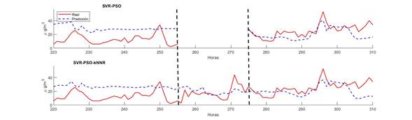 En la construcción del modelo predictivo de PM10 y PM2.5 con un horizonte predictivo de 24 horas utilizando SVR-PSO se tomó como conjunto de entrenamiento los datos del año 2013 los cuales fueron divididos aleatoriamente en 70/30 y se realizó la validación en los años 2014, 2015 y 2016. El PSO buscó maximizar el R2 y como parámetros se determinaron 100 iteraciones y un total de 20 partículas.