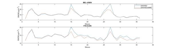 Para seleccionar el mejor grupo de características, así como la mejor escala temporal, se realizó la predicción de PM2.5 y PM10 durante el periodo 2014-2016 usando SVR-PSO, donde obtuvo el RMSE por mes.